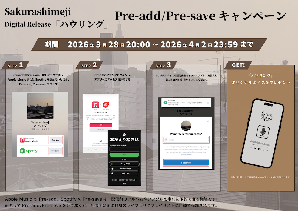2026年4月3日(金)より配信される、Sakurashimejiの新曲「ハウリング」のリリースに先駆けて、期間中にApple MusicでPre-Add、SpotifyでPre-Saveしていただいた方全員に、オリジナルボイスをプレゼント!