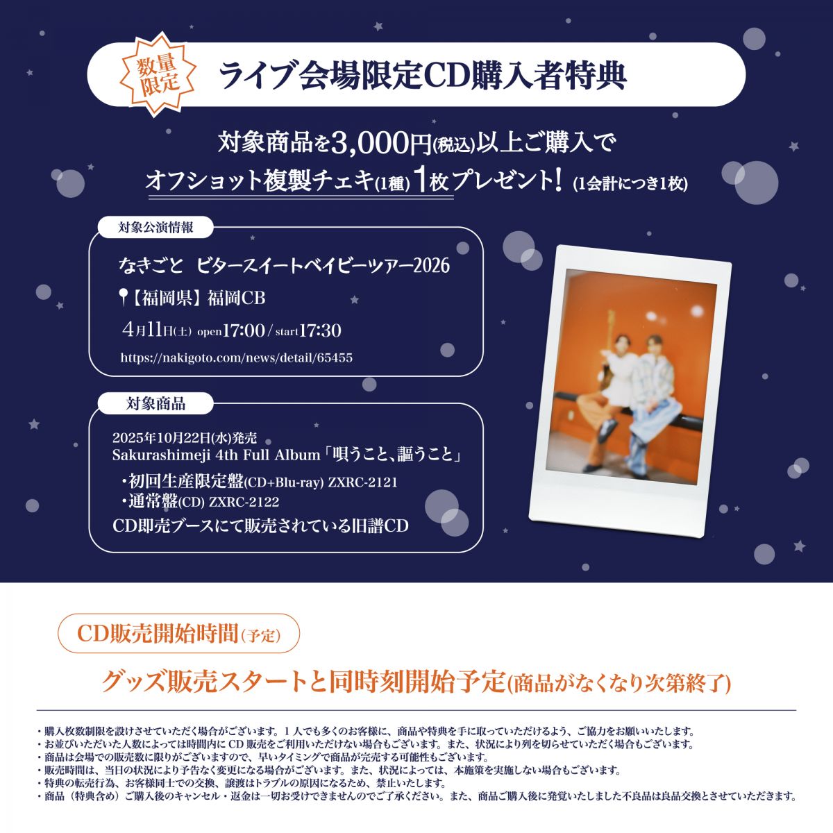 4/11(土) Sakurashimejiゲスト出演「なきごと ビタースイートベイビーツアー2026」福岡公演ライブ会場限定CD購入者特典決定のお知らせ!